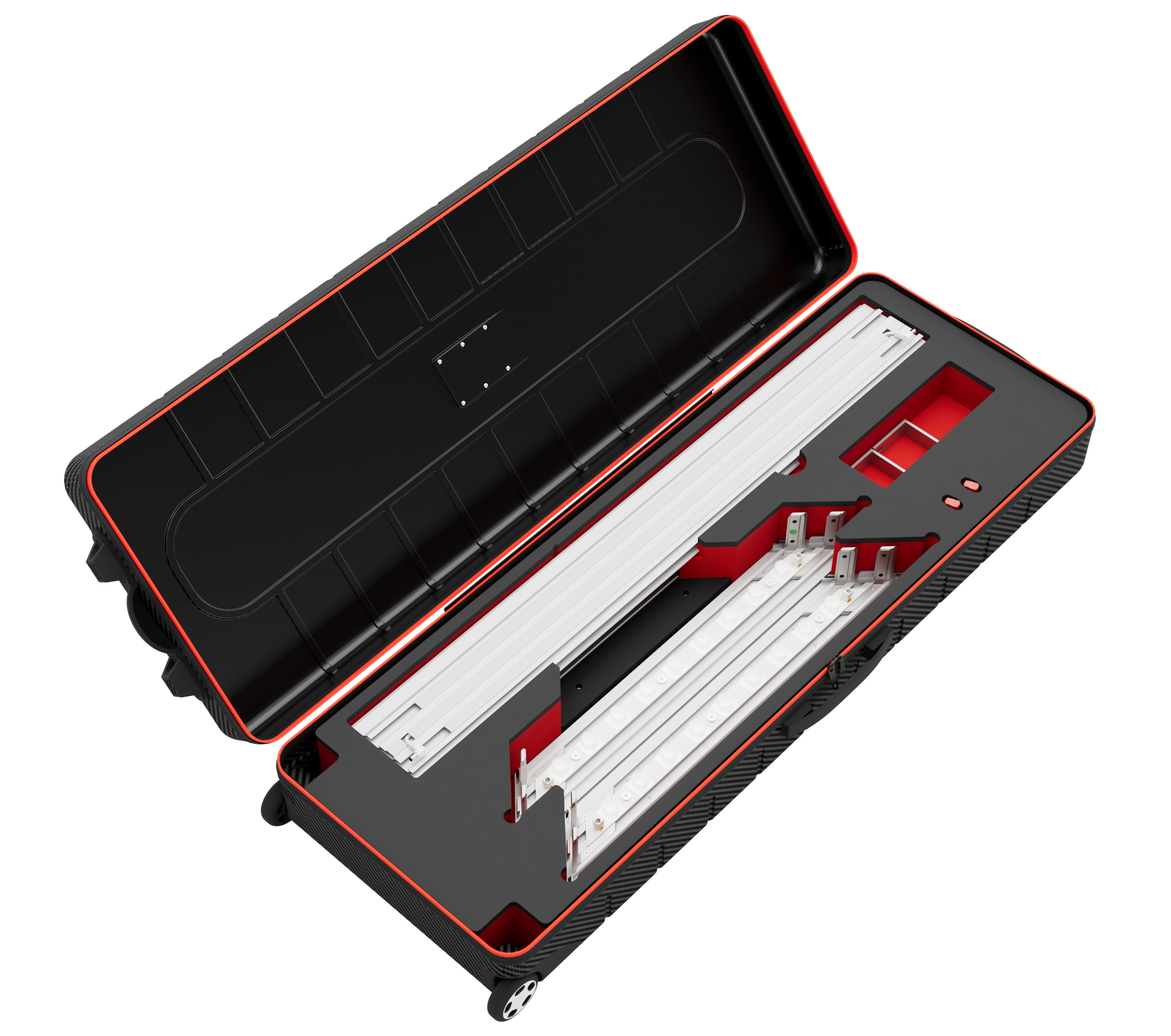 Alle Komponenten des Counter ONE corner Kits werden sicher und kompakt in einem robusten ABS-Koffer (120 x 21 x 40 cm, 14 kg)) verpackt. Dieser sorgt nicht nur für maximalen Schutz während des Transports, sondern ermöglicht auch eine einfache und platzsparende Lagerung.