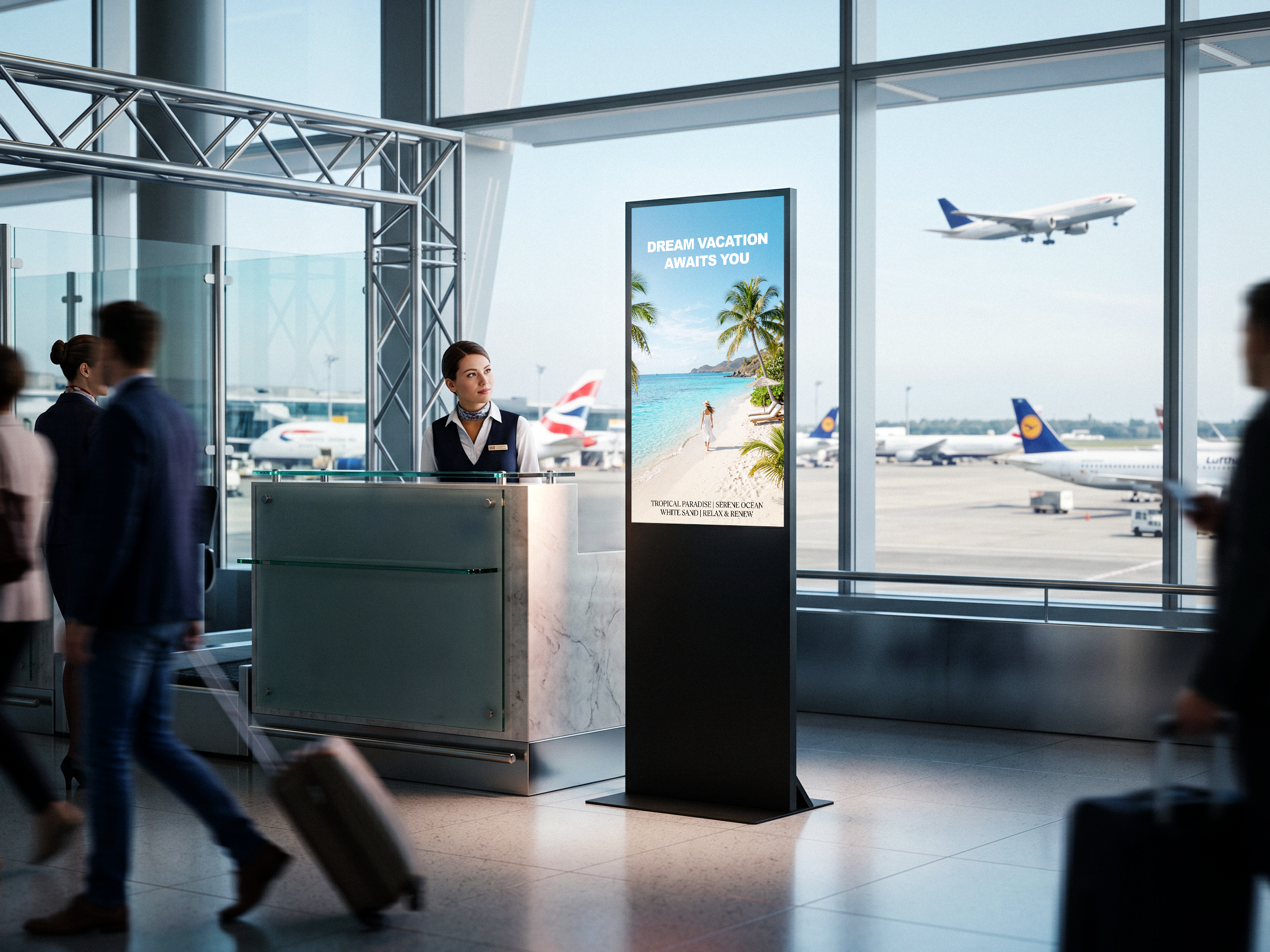 Eine schlanke Stele mit FullHD Monitor auf Augenhöhe. Diese extrem schlanke digitale Stele beinhaltet ein FullHD LCD-Display und einen integrierten Media Player. Das Display spielt Videos, Animationen, Bilder und bei Bedarf auch Ton in einem Loop ab. Nach der Montage der Bodenplatte kann die Stele sehr einfach in Betrieb genommen werden.